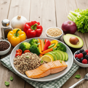 - Opción de Almidón: Un plato de quinua con brócoli, champiñones y pimientos salteados en aceite de oliva.